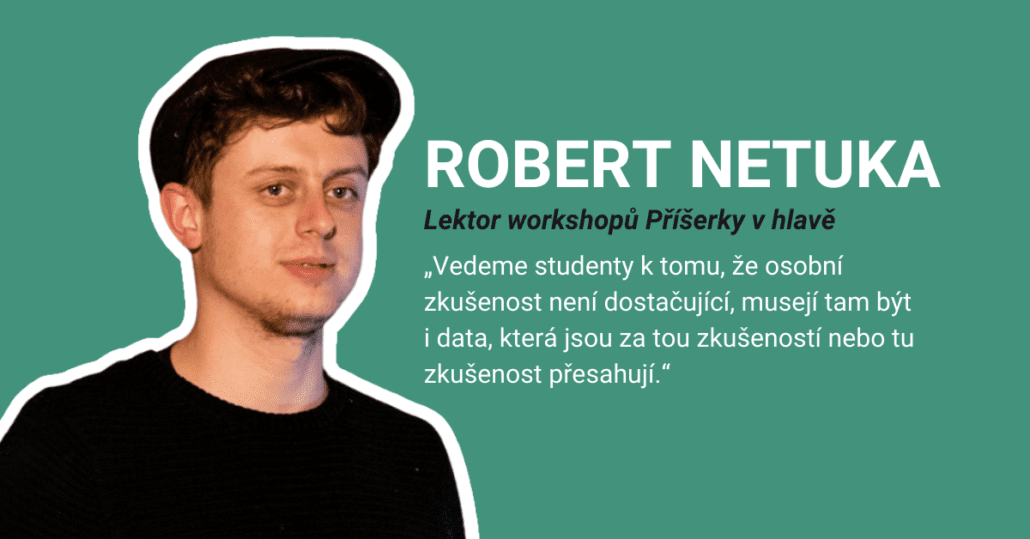Robert: Většinou je to zjištění, jaká je největší národnostní menšina u nás a sice, že jsou to Ukrajinci. Pak žáky hodně překvapuje, ze kterých zemí v Česku nejvíc lidí žádá o mezinárodní ochranu, a sice, že tam na druhém místě figuruje Gruzie. Zajímavé je, že si většina žáků myslí, že nejvíc cizinců pracuje v maloobchodu a velkoobchodu, takže jsou potom velice překvapení, že je to průmysl. My se jim to snažíme vysvětlit tak, že to, s čím se většinou setkávají, ještě nemusí odrážet tu celkovou realitu, že ta přímá zkušenost holt nestačí. Nikdo většinou nechodí domů kolem fabrik, zato přes večerky nejspíš ano. Nicméně tu přímou zkušenost jim nevyvracíme, ať se jedná o pozitivní nebo negativní. Vedeme studenty k tomu, že osobní zkušenost není dostačující, musejí tam být i data, která jsou za tou zkušeností nebo danou zkušenost přesahují.