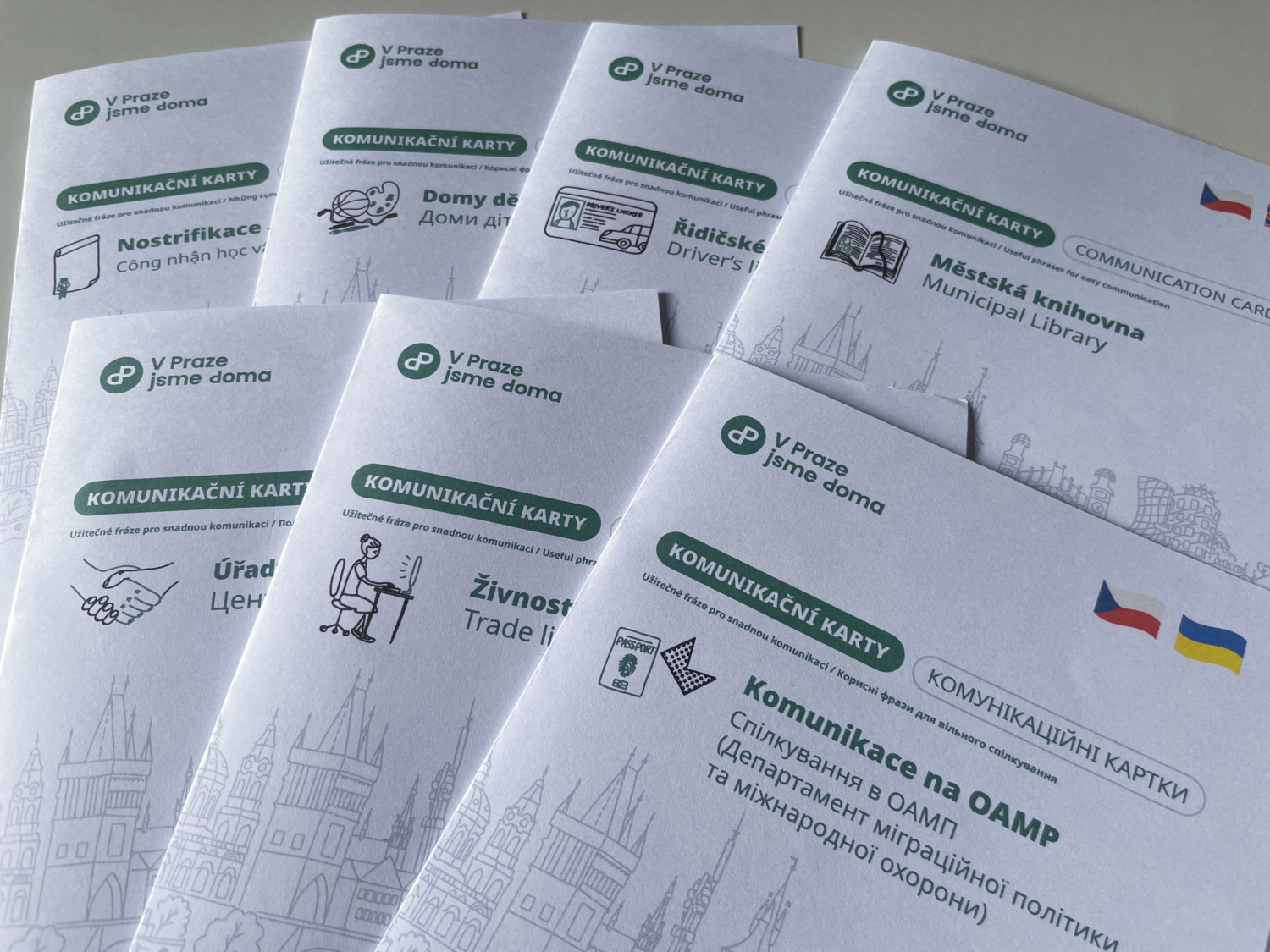 Web V Praze jsme doma dále nabízí ke stažení také nově vzniklé dvojjazyčné karty pro cizince, které usnadňují vzájemnou komunikaci na úřadech a v institucích. Karty obsahují ty nejpoužívanější komunikační fráze a slovník důležitých pojmů pro návštěvu OAMP, živnostenského odboru, úřadu práce, registru řidičů, knihoven, domů dětí a mládeže nebo k vyřízení uznání zahraničního vzdělávání.