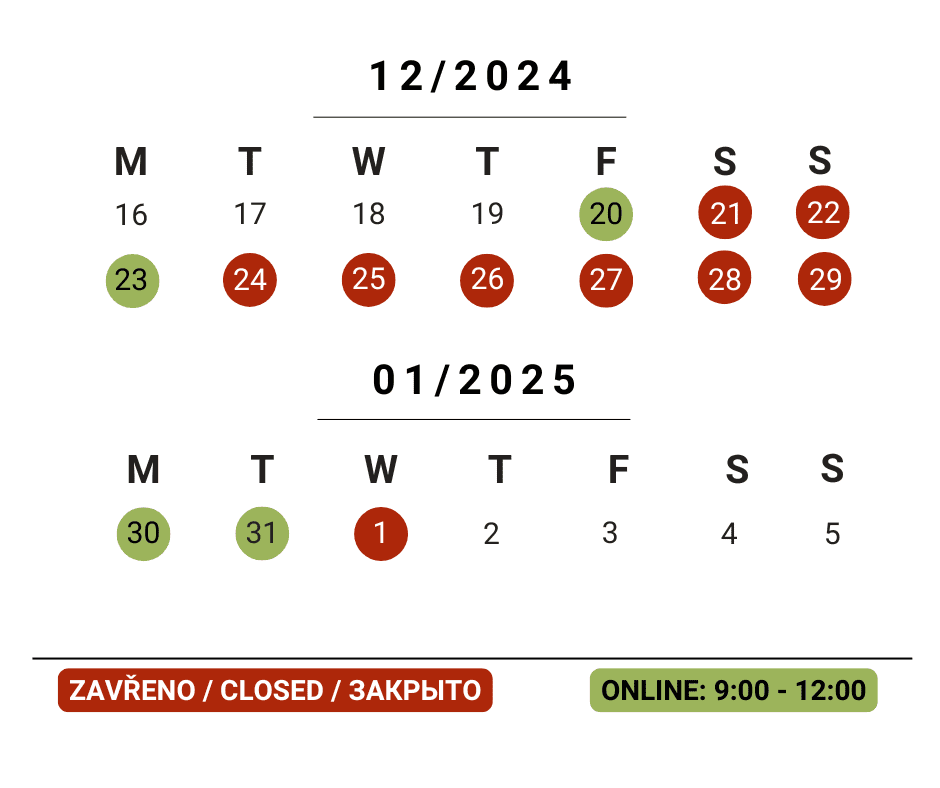 rádi bychom vás upozornili, že od 20. prosince do 1. ledna (včetně) je provoz našeho centra omezen. Detailní rozpis provozní doby v tomto období jsme pro vás znázornili do přehledného kalendáře.