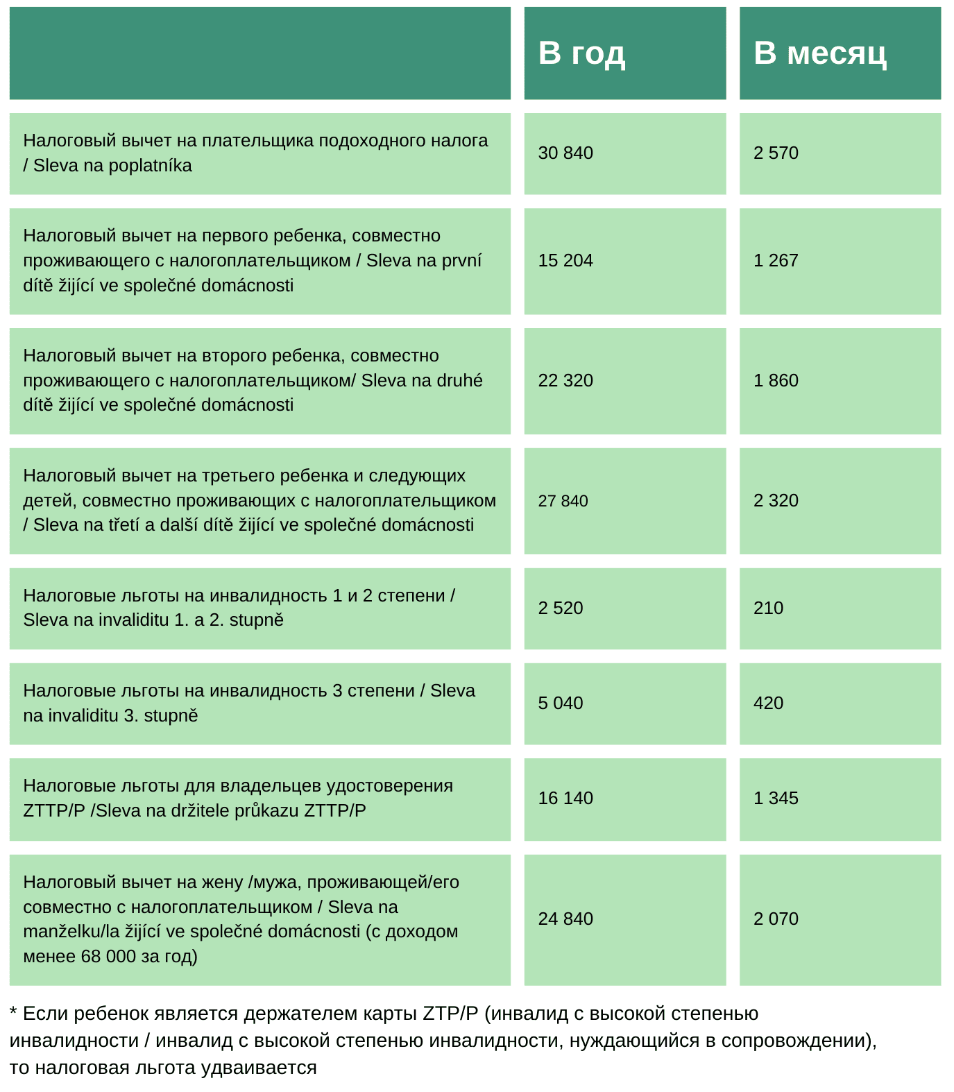 Так называемый «Розовый бланк» (Заявление налогоплательщика в случае получения дохода физическим лицом) / “Růžové prohlášení” (Prohlášení poplatníka daně z příjmu fyzických osob) – это бланк, позволяющий использовать ежемесячные вычеты из подоходного налога. В случае, если у вас одновременно более одного работодателя, вышеуказанное заявление за календарный месяц может быть подписано только у одного из них. Если же вы поменяли работодателя в течение года, вы можете подписать заявление у нового работодателя после прекращения предыдущих трудовых отношений. При заполнении бланка укажите ежемесячные льготы, на которые вы имеете право. Исходя из этого работодатель вам скорректирует сумму авансового платежа по налогу, уплачиваемому государству.